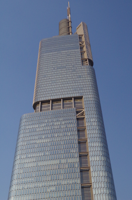 Onder aan de Zifengtoren, met uitkijkplatform op de 72ste verdieping (zie volgende foto's)